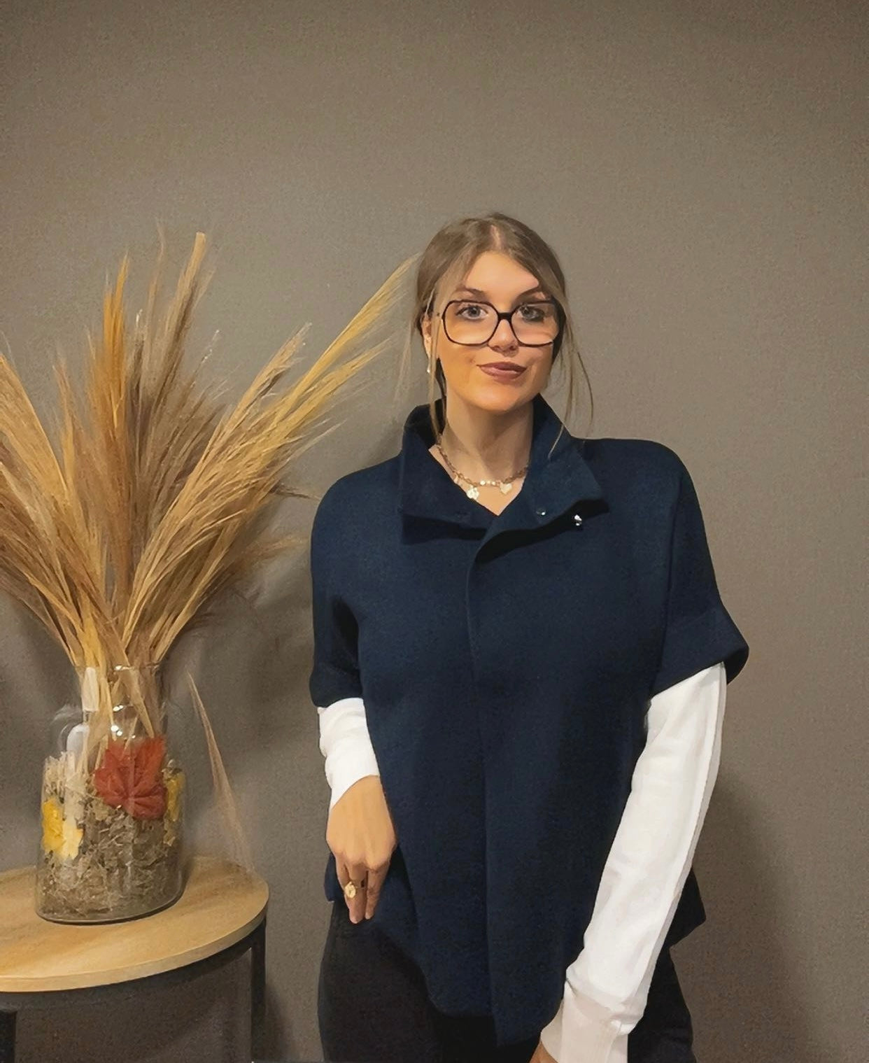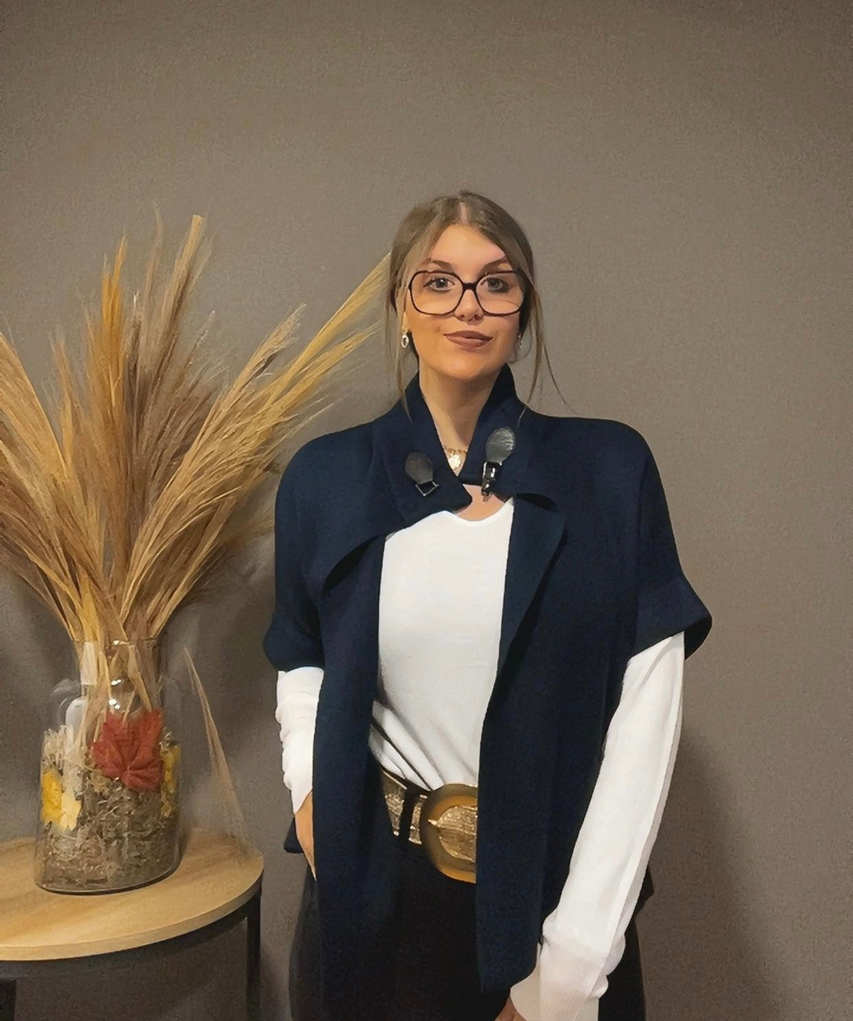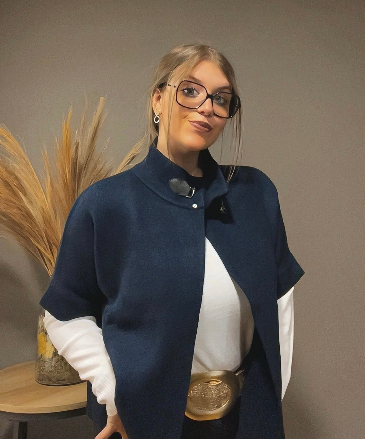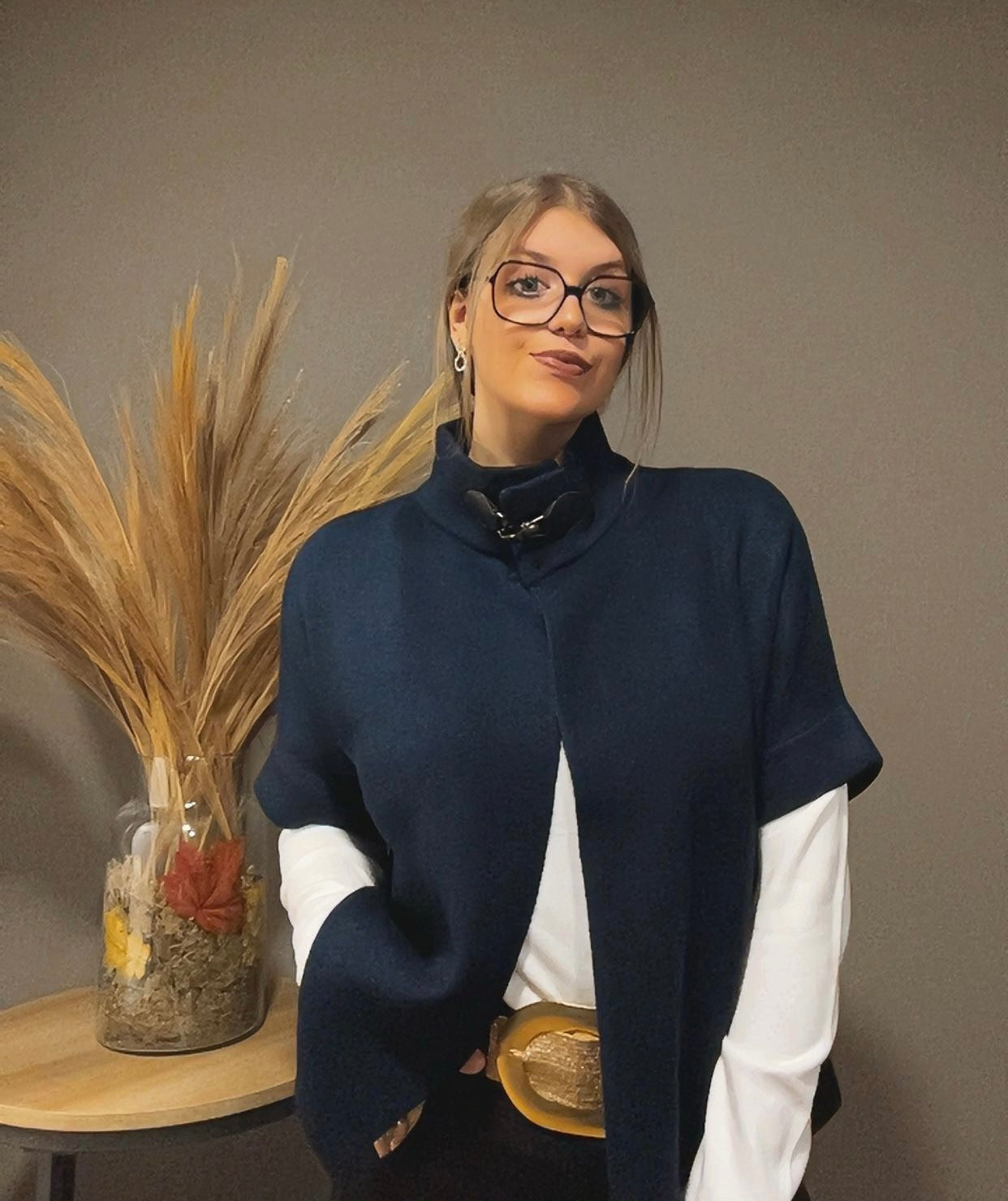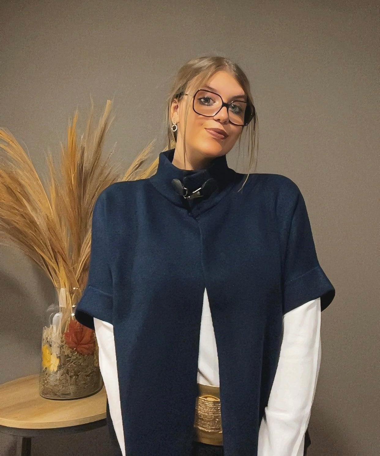 Alliant style et praticité, cette cape bleu marine apporte une touche chic à toutes vos tenues. Son tissu fluide et sa coupe moderne offrent confort et élégance, tandis que le col montant et la fermeture par bouton et attache soulignent son allure sophistiquée. Parfaite à superposer sur une chemise ou un pull.
