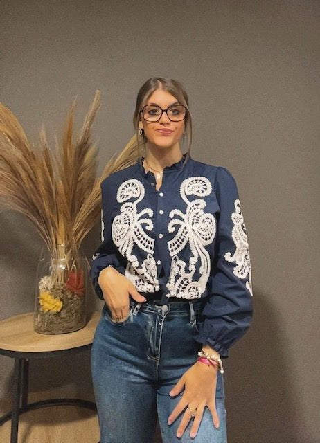Ce chemisier en coton 100% allie confort et élégance avec ses délicates broderies blanches florales et feuillages sur le devant et les manches. Sa coupe classique légèrement cintrée, son col en V et ses manches longues en font une pièce féminine et raffinée, parfaite au quotidien.