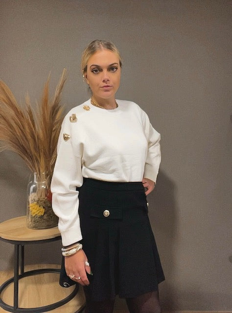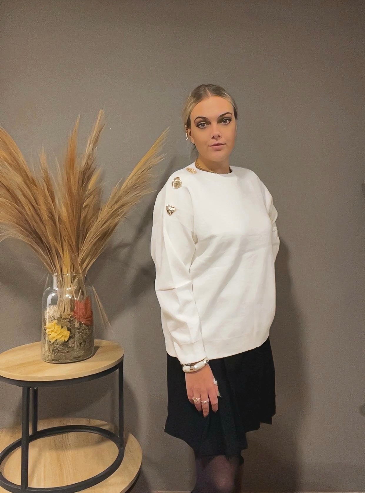 Apporte une touche d’élégance à ta tenue avec ce pull blanc orné de détails dorés subtils sur les épaules. Conçu pour allier confort et style, il rehausse facilement ton look au quotidien ou pour des occasions plus habillées.