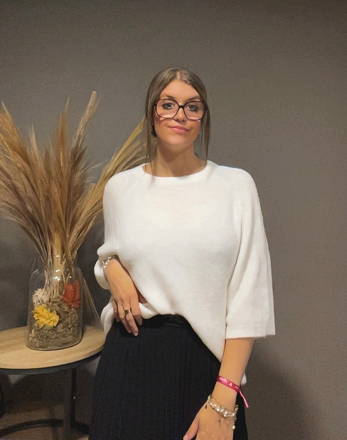 Un pull élégant, conçu avec des manches 3/4 pour un style raffiné et féminin. Sa maille douce et confortable en mélange de fibres naturelles et synthétiques en fait une pièce idéale pour la mi-saison comme pour l’hiver.