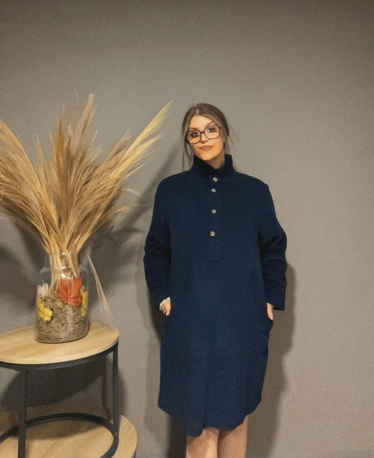 Alliant confort et élégance, cette robe en velours côtelé bleu marine met en valeur la silhouette. Ses poches latérales ajoutent une touche pratique et moderne. Parfaite au quotidien ou pour une sortie chic.
