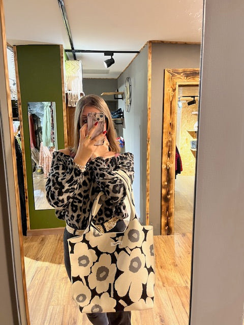 Un sac à main spacieux, au style élégant et moderne, avec un imprimé floral noir et blanc. Parfait pour celles qui souhaitent allier praticité et style, ce sac peut accueillir toutes vos affaires du quotidien avec élégance.