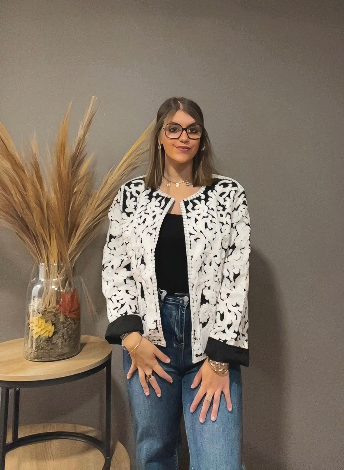 Découvrez l’alliance parfaite entre audace et élégance avec notre veste. Son motif floral noir et blanc saisissant apporte une touche artistique et sophistiquée à votre tenue, idéale pour la femme moderne qui aime se démarquer.
