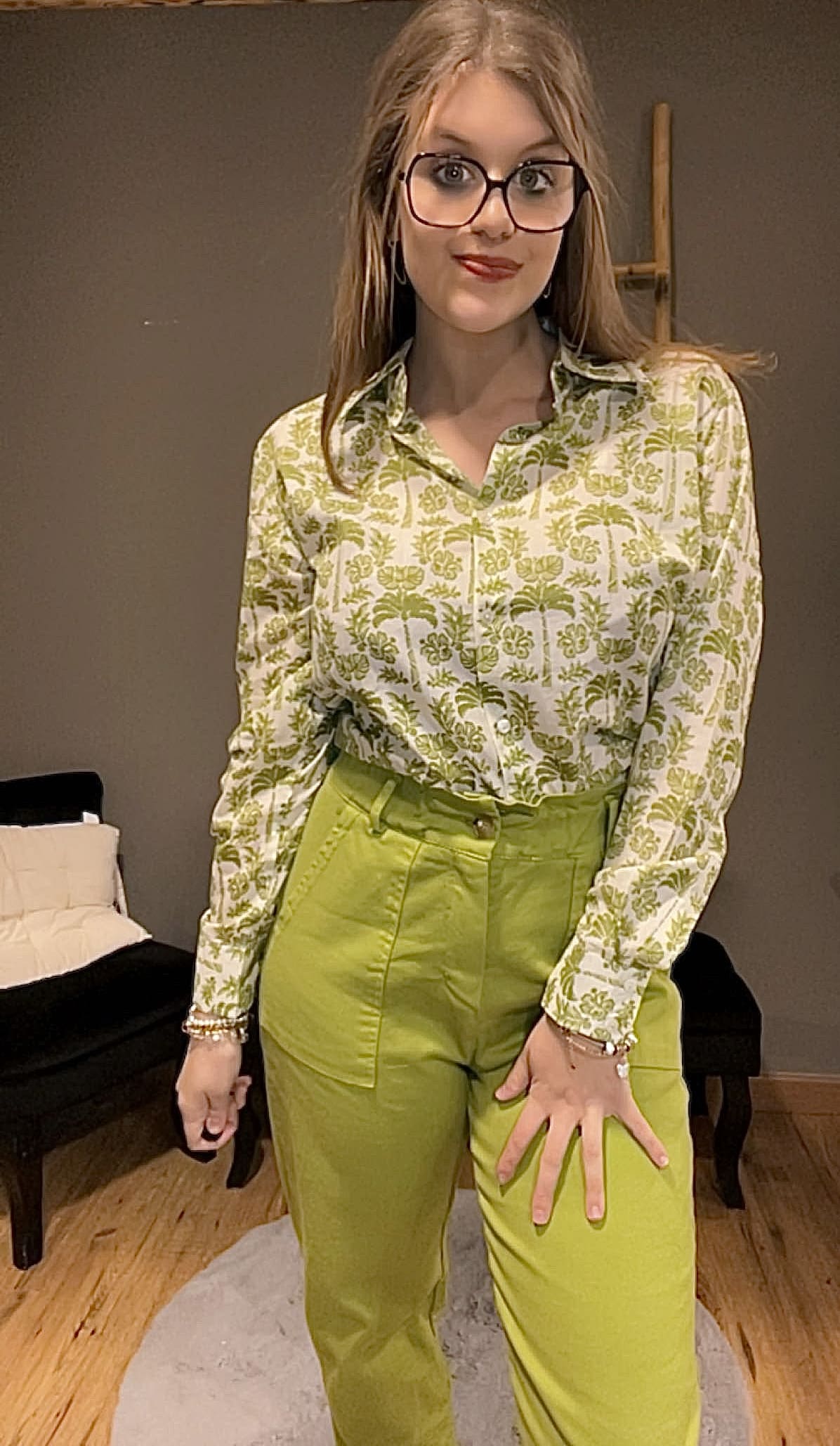 - Coloris : Motifs verts sur un fond crème/écru pour un rendu naturel et facile à porter.