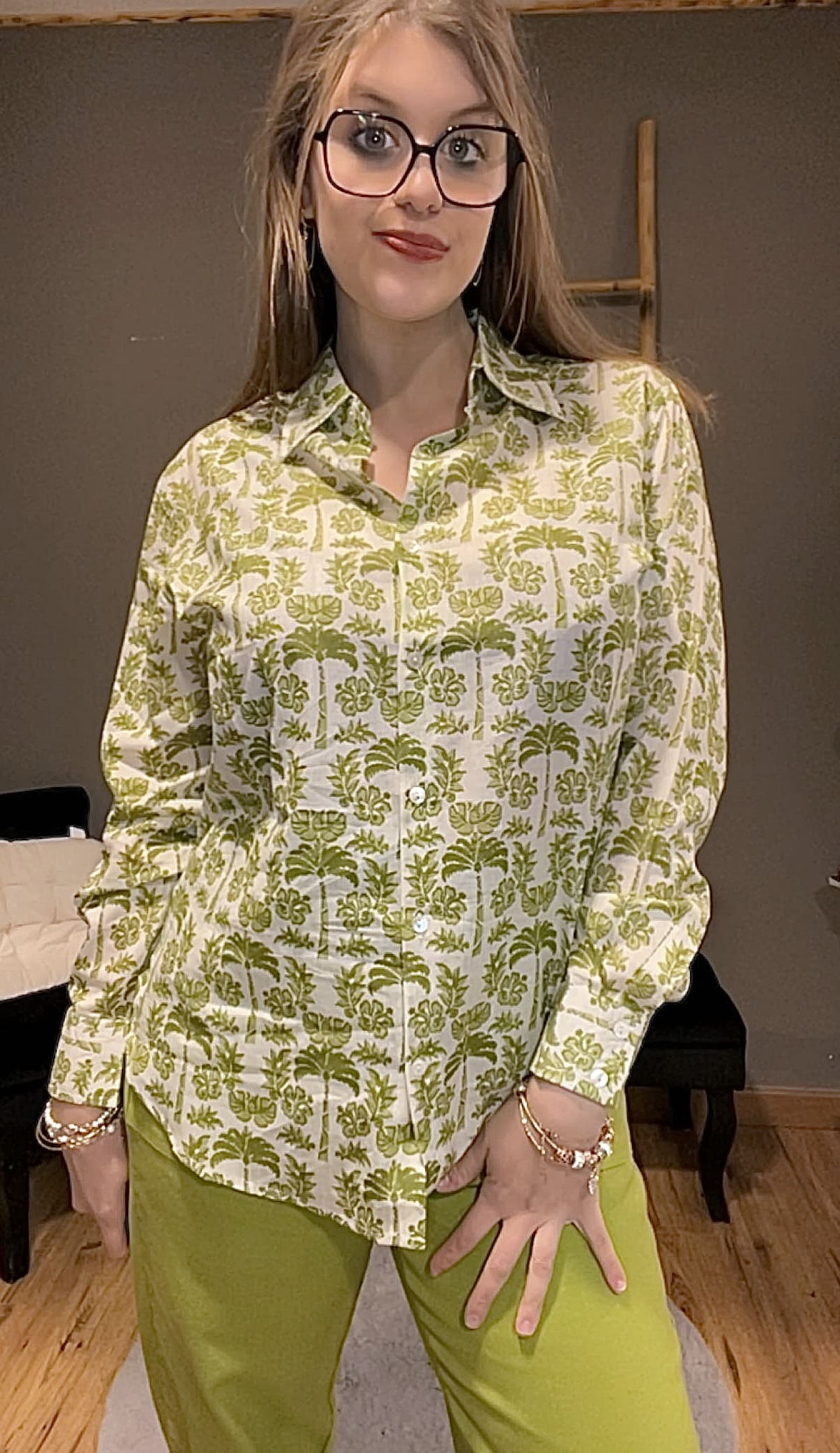 Laissez un air de vacances entrer dans votre dressing avec ce chemisier aux motifs palmier, une pièce fraîche et lumineuse qui sent bon l'été.